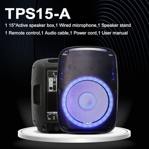 Comprehensive Package: Comes with a 15'' active speaker box, wired microphone, speaker stand, remote control, audio cable, power cord, and user manual. Exceptional Audio Quality: Delivers 120 watts of robust bass and clear audio, perfect for musicians, singers, and performers. Suitable for both indoor and outdoor events. Versatile Connectivity: Equipped with Bluetooth, FM radio, USB drive, and SD card functions. Instantly pair with smartphones and other devices or insert a USB/SD card to play your favorite songs. Convenient Controls: Use the included remote control to switch modes, play/pause music, navigate songs, and adjust volume from up to 20 feet away. Dynamic LED Lights: Built-in color-changing LED lights enhance the party atmosphere with a captivating light show.