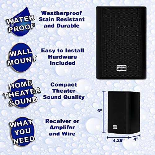 Outdoor Mountable: Easy to install with included mounting brackets, these speakers are perfect for patios, decks, pool areas, and more. Powerful Sound: Enjoy full-range audio coverage with a 2-way tweeter and woofer configuration, suitable for home theater, whole house audio systems, and business installations. Weatherproof Design: Durable ABS sealed cabinets with spring-loaded raw wire connectors resist rain, snow, sun, and ice, ensuring longevity. Specifications: Each speaker measures 6" x 4.25" x 4" and houses 3" Poly Mica woofers with butyl rubber surrounds and .5" PEI dome tweeters. They support a frequency response of 100Hz-20 KHz with 89dB at 8 ohms. Connectivity: Requires any amplifier or receiver with raw speaker wire outputs. Compatible with amps delivering 20-250 watts per channel. What’s in the Box: Includes 2 Acoustic Audio AA351B speakers, mounting brackets with hardware, and an instruction manual.
