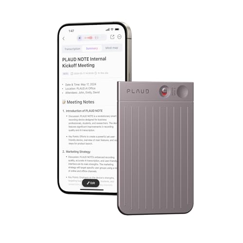 Dual-Mode Precision Recording: With air conduction for ambient sounds and Vibration Conduction Sensor (VCS) for phone calls, ensure every detail is captured clearly. Privacy First: Local encryption for data, exclusive cloud storage, and processing only upon your authorization. Manage, sort, and share audio files effortlessly via the PLAUD App and Web portal. Long-Lasting Use: 64GB storage fits up to 480 hours of recordings, and a battery life of 30 hours ensures you won’t miss a moment. Convenient Tools: PLAUD App includes transcription, summarization, audio trimming, and speaker labels for easy editing and navigation. Complete Package: Comes with a black case, magnetic ring, and charging cable. Enjoy 300 minutes per month of free transcription and summarization.